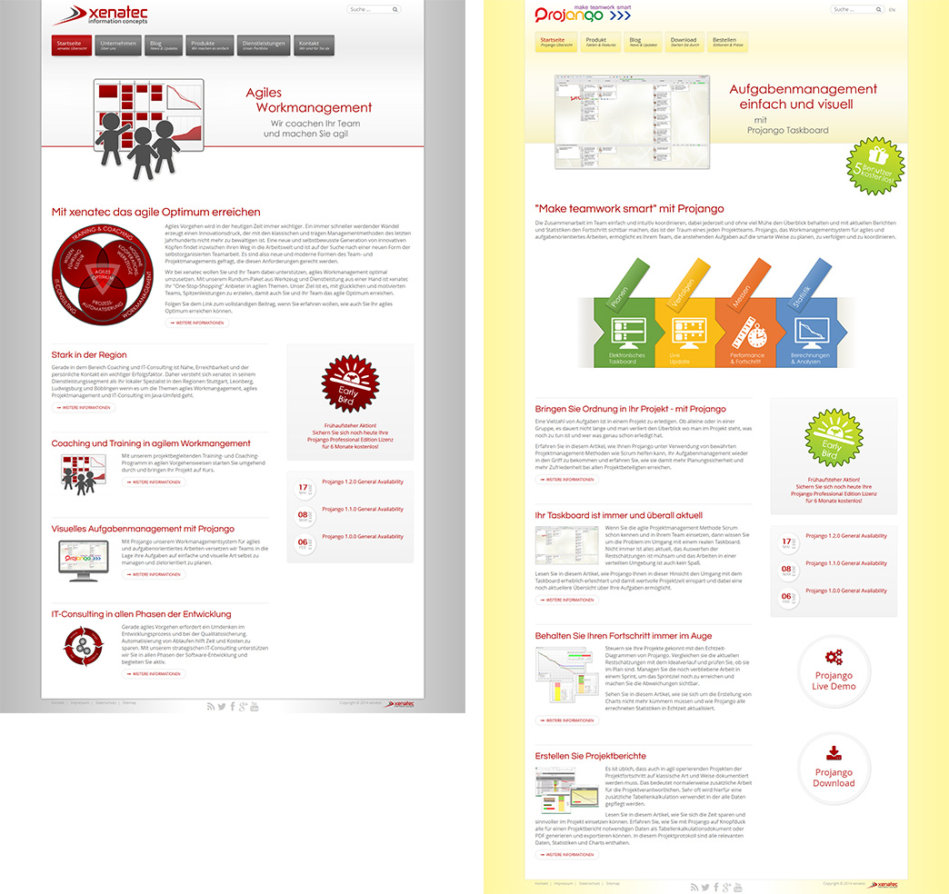 As can be seen in comparison, the two pages are technically related but entirely different in their character. While the Xenatec pages are reduced to their fundamental colors, emanating straightness and reliability, the Projango pages present themselves colorful and loosened up, communicating exactly the cheerfulness we want to bring to the daily work with our visual work management system for task oriented work.